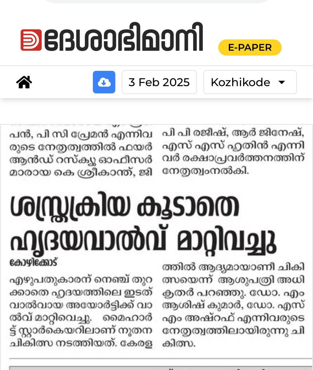 ശസ്ത്രക്രിയ ഇല്ലാതെ ഡ്രൈ ടിഷ്യൂ വാല്‍വ് മാറ്റിവെച്ചു, കേരളത്തില്‍ ആദ്യം……
